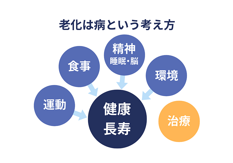 などです。言い換えれば、「まだ病気には至っていないが、健康から離れつつある状態」です。この未病のコントロール次第で老化の進み方に差が生まれ、結果として寿命の違いにもつながります。だからこそ、特定の病気を発症してから治療するのではなく、日常生活の中で心身の状態を整え、より健康な状態に近づける“未病を治す”取組みが重要です。