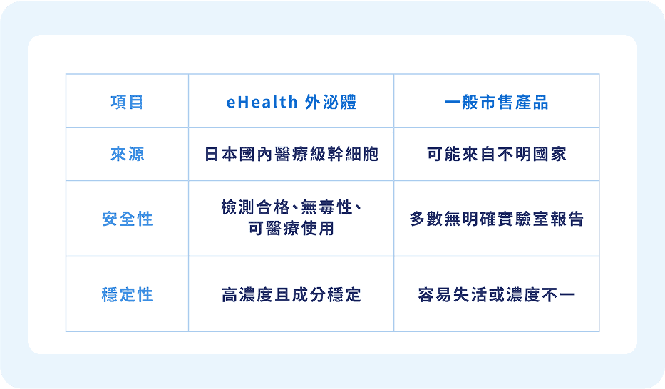 安全與高效是外泌體療程最重視的要素。有別於市面上來源不明或製程不透明的外泌體,eHealth 堅持在 ISO100的潔淨標準實驗室生產的外泌體。