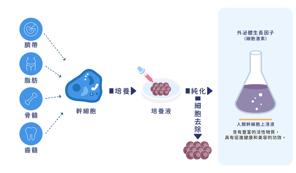 從幹細胞培養基中,移除幹細胞後去除雜質和滅菌所獲取,為幹細胞上清液,含有生長因子(細胞激素)和外泌體等活性物質。