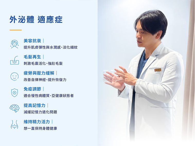 隨著年齡增長與生活壓力累積,身體的自我修復力會逐漸下降,外泌體點滴可補充細胞間傳遞的修復訊息,幫助細胞回春、回到健康平衡狀態。