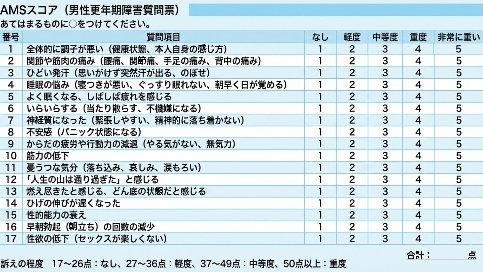 客観的に症状の重さを知るために、質問票(アンケート)に記入してもらうことが一般的です。男性更年期障害の診断では「AMSスコア(Aging Male Symptomsスコア)」という質問票がよく用いられます。